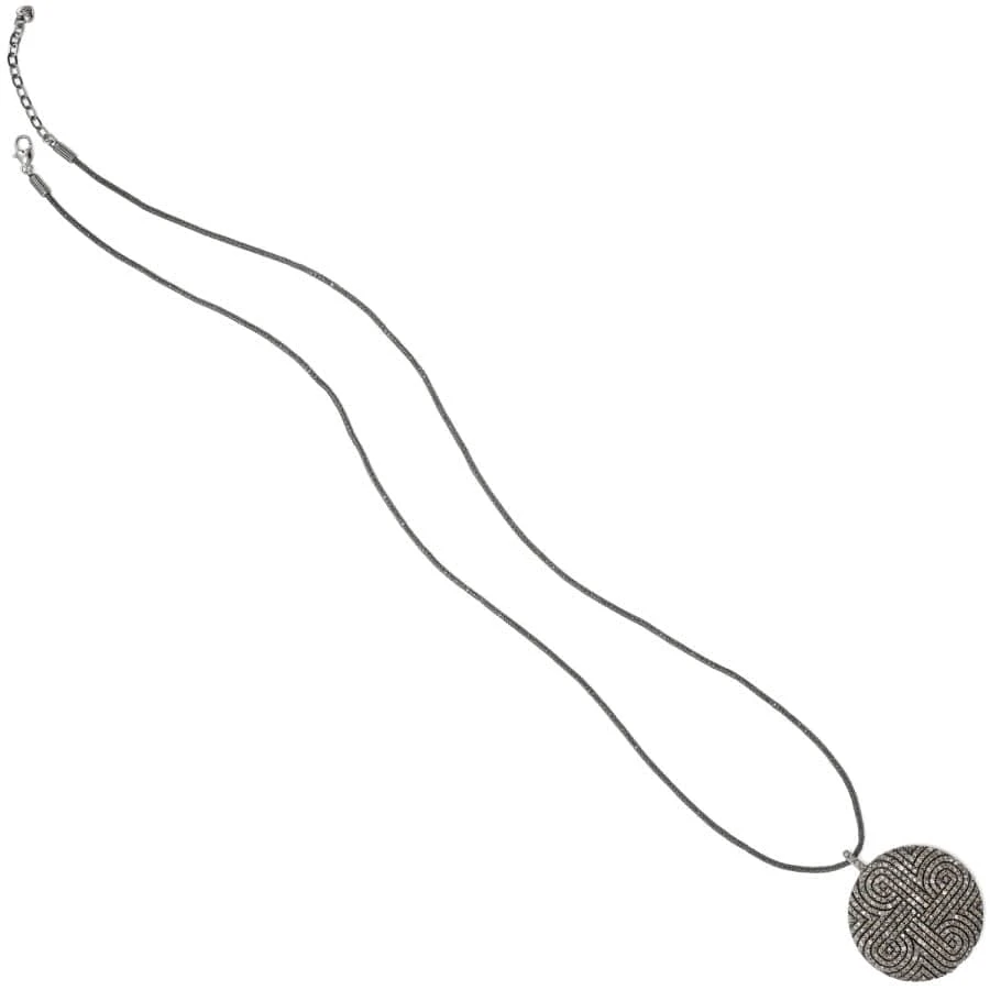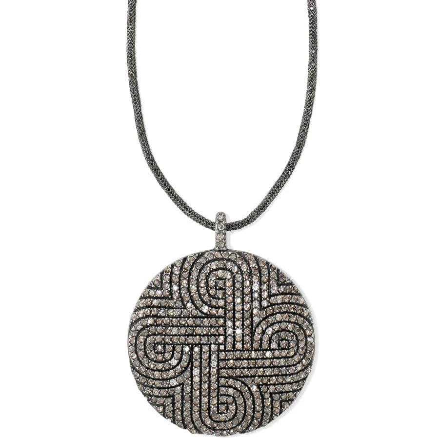 Two completely different motifs embellish the front and back of this dazzling statement necklace–a labyrinthine pattern graces its front, while vine-like tendrils intertwine with fine quality crystal on the reverse. Wear it long or short!