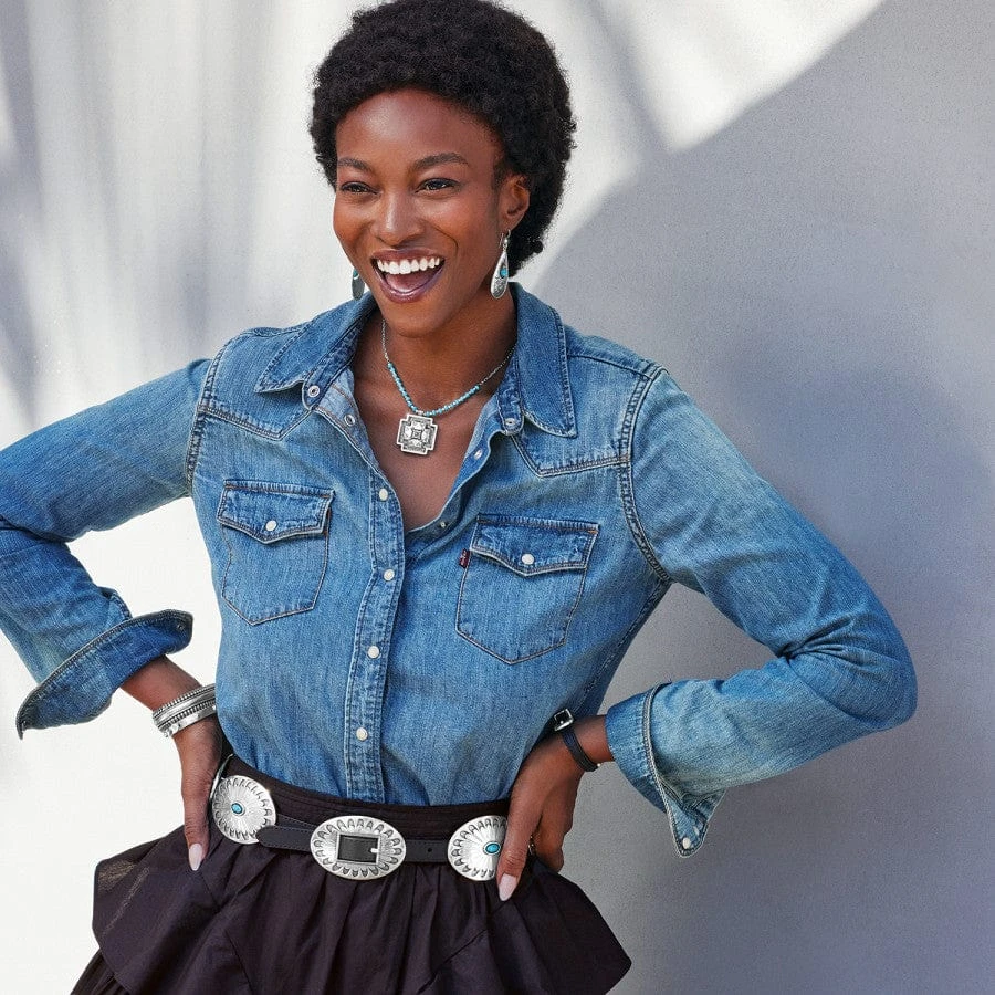 Handcrafted in Los Angeles using the finest materials sourced from around the world, this Latigo leather belt features sliding conchos with engraved filigrees and turquoise accents.